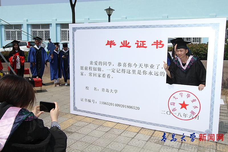場館外,學校搭建了“畢業小鎮”,設置了“青青校園”“青大時光機”“我們畢業了”“鏤空畢業證”“學在青大”等主題元素的簡易背景墻,畢業生們紛紛在此合影留念。