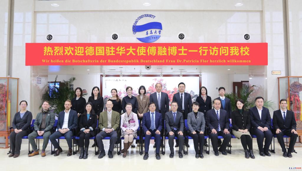 魏志強對傅融大使一行的來訪表示歡迎,并從“歷史久”“學科全”“規模大”“發展快”和“特色強”五個方面介紹了學校的歷史沿革和發展情況。他表示,在德國駐華使館,山東省委外辦和青島市委外辦的大力支持和指導下,青島大學與德國的教育交流與合作蓬勃發展,魯巴教育合作項目-青島大學德語系已經走過30年的發展歷程,累計為中德兩國各領域合作與交流輸送800余名畢業生,成為中德政治、經濟、文化和教育交流的友好使者。他指出,今年是中德建立全方位戰略伙伴關系10周年,兩國領導人分別在4月和11月會晤,為中德關系進一步發展指明了方向。他希望以傅融大使此次來訪為契機,與更多的德國高校和科研機構在人工智能、醫學、新材料和新能源等領域開展高層次人才培養和科研合作,為中德兩國交流培養更多高素質國際化人才,為鞏固中德兩國伙伴關系、造福兩國人民貢獻力量。