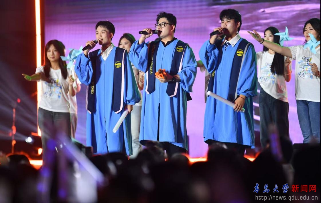 晚會融合了樂團、電聲樂隊、情景演唱、舞蹈、相聲、朗誦等多種精彩表演形式,并與精心設計的服裝走秀相得益彰,打造了一場立體而多元的現場演出。在回憶往昔的時光里,深情的歌聲傳遞了畢業生們難舍的離別之情;在把握當下的青春年華中,堅定的姿態展現了青大青年奮勇向前的青春風采;在展望未來的旅途中,激昂的旋律描繪了新時代青大青年奮發向前的壯志豪情。