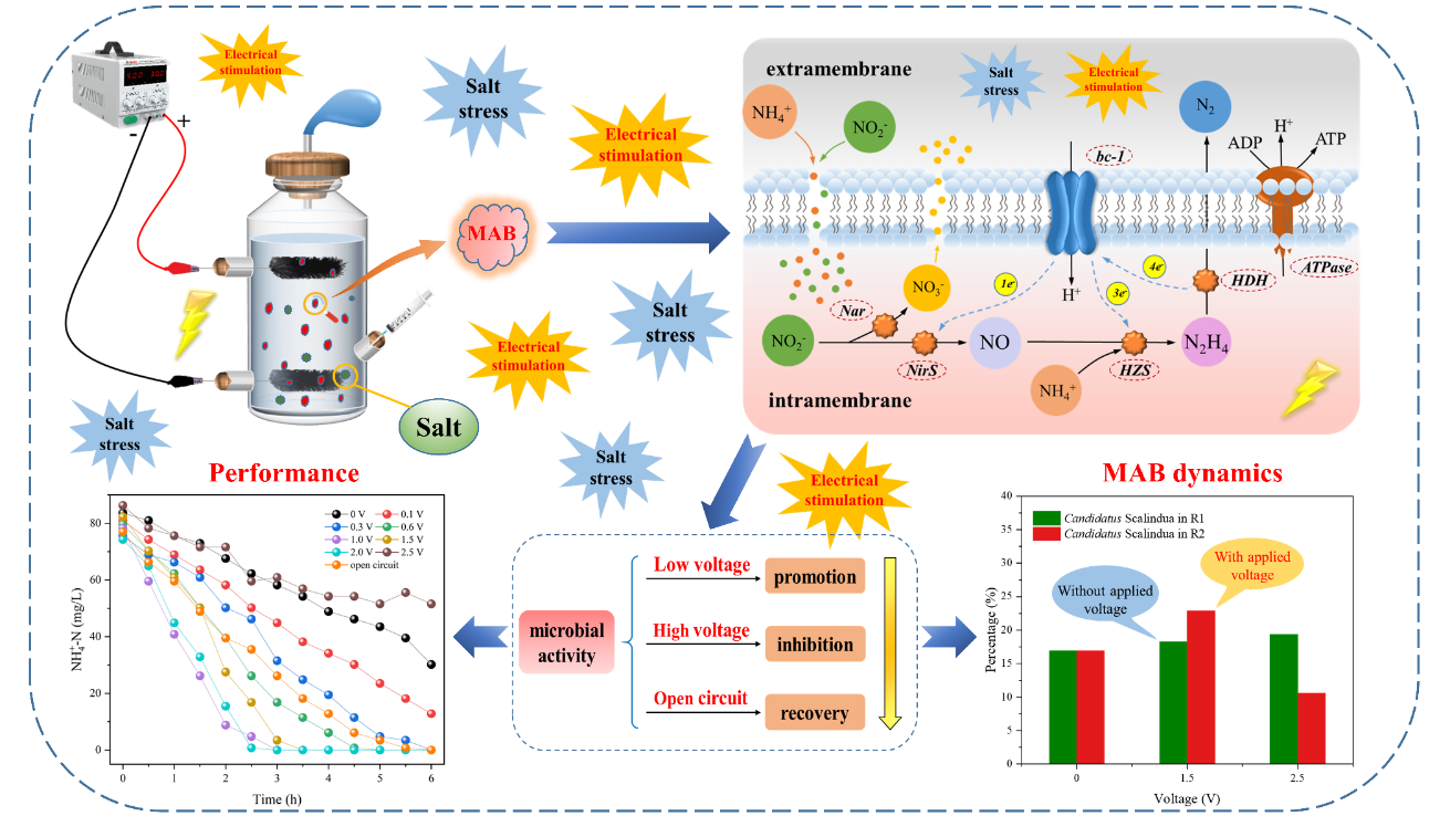 該研究主要圍繞高鹽廢水生物處理過程中海洋厭氧氨氧化菌生長速率慢以及對運行環境變化敏感度高這一問題,利用微生物電化學技術對海洋厭氧氨氧化菌的脫氮性能和生物活性進行了強化,并對電場強化作用下的微生物群落結構和動態演替進行了深入解析。研究結果表明在電場作用下,海洋厭氧氨氧化菌的脫氮性能以及生物活性均得到了較大提升,此外,該菌種的豐度也顯著提高,說明微生物電化學技術可以有效提升高鹽廢水處理效能。該研究工作得到了國家自然科學基金(51878362,52070105)、中國博后特助、中國博后面上一等資助以及中國石油集團等多項課題資助,研究成果豐富和拓展了微生物電化學技術在含鹽污水生物脫氮方面的理論和應用,為高鹽廢水治理提供了創新思路和理論依據。