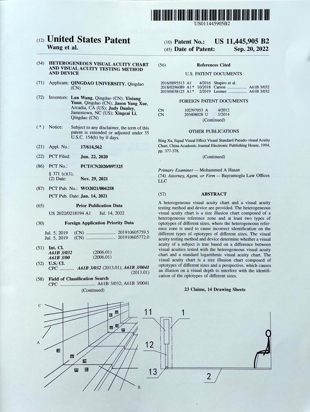 新聞網訊 近日,我校汪嵐教授獲得一項PCT美國發明專利授權《一種異構視力表及視力檢驗方法和裝置》(PCT號:PCT/CN2020/097325)/HETEROGENEOUS VISUAL ACUITY CHART AND VISUAL ACUITY TESTING METHOD AND DEVICE(Patent No.:US11445905),這是青島大學人文社科研究取得的首個PCT發明專利。