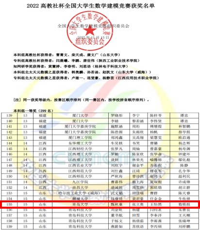 新聞網(wǎng)訊 近日,2022高教社杯全國大學(xué)生數(shù)學(xué)建模競賽成績揭曉,經(jīng)省級、國家級專家組評審,電子信息學(xué)院2020級本科生甄秋童團隊獲國家一等獎。據(jù)悉,該獎項獲獎比例約為全部參賽隊伍的0.6%,同題目山東省國家級一等獎僅有4項。團隊隊員由電子信息學(xué)院2020級本科生甄秋童、自動化學(xué)院2020級本科生張立奧、計算機科學(xué)技術(shù)學(xué)院2020級本科生王怡然組成,指導(dǎo)教師為數(shù)模組。我校另有三個學(xué)生團隊獲得國賽二等獎。