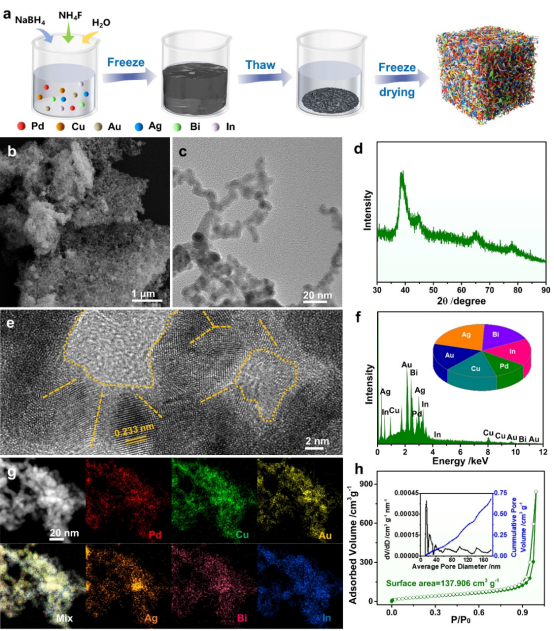 為此,研究團隊通過凍融法首次實現了高熵合金氣凝膠的普適性制備,成功得到了一系列高效穩定的新型二氧化碳電還原催化劑(六元PdCuAuAgBiIn、七元PdCuAuAgBiInCo、七元PdCuAuAgBiInZn、八元PdCuAuAgBiInCoNi以及九元PdCuAuAgBiInCoNiZn高熵合金氣凝膠)。機理研究表明,高熵合金氣凝膠獨特的大孔隙率和高比表面積的三維網絡結構,提供了豐富的配位不飽和催化位點和快速傳質通道、金屬間的強相互作用調控了活性中心電子結構,優化了催化劑表面HCOO*中間體的吸附和解吸強度,抑制了一氧化碳產生和析氫,從而增強了其催化活性、選擇性及穩定性。這項工作不僅為高熵合金氣凝膠的可控合成提供了新策略,還為高效二氧化碳電還原提供了新的材料平臺,并將推動其在催化及其他領域的研究。