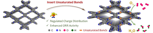 由于不飽和鍵/配位不飽和環(huán)境可有效提供催化活性位點(diǎn)和電荷傳輸通道。例如,在金屬基催化劑中,其配位不飽和特性可以顯著促進(jìn)反應(yīng)物的化學(xué)吸附,并通過(guò)快速的界面電荷轉(zhuǎn)移誘導(dǎo)高電子電導(dǎo)率,從而增強(qiáng)電催化活性。在非金屬碳基催化劑中,各種不飽和形式的碳材料,特別是sp或sp2雜化原子很容易被活化,也被證明是優(yōu)化氧吸附能和提高性能的有效方法。然而,目前仍缺乏有效的策略來(lái)精確控制此類(lèi)催化體系中不飽和態(tài)的結(jié)構(gòu)以及不飽和位點(diǎn)在整個(gè)結(jié)構(gòu)中的催化反應(yīng)機(jī)制。