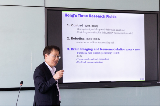 洪金植介紹了“認知機電”的新領域,尤其是腦神經信號的生物原理,以及如何利用功能性功能性近紅外光譜技術(functional near - infrared spectroscopy , fNIRS)對腦部區域信號進行檢測。借由腦機接口技術,可以實現神經退行性疾病的早期診斷,并根據腦信號模式特征,針對性開展直流/交流電流的非侵入式腦刺激方法,刺激腦部相關區域,使處在非正常退化現象的腦細胞恢復到正常水平,以此來解決藥物治療智能將神經退行性疾病短暫延遲的局限問題。報告語言生動、脈絡清晰,與在場師生進行了交流探討。
