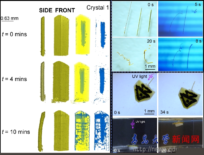 新聞網(wǎng)訊 近日,我校化學化工學院王國明教授團隊在光機械響應晶體領域取得重要研究進展,研究成果以“Bending, Twisting, and Propulsion of Photoreactive Crystals by Controlled Gas Release“為題發(fā)表在國際頂級期刊Angewandte Chemie上(Angew. Chem. Int. Ed.2024, e202403397)。我校為第一完成與通訊作者單位,王國明教授、喻琪副教授和紐約大學Pance Naumov教授為共同通訊作者。第一作者為我校2022級在讀碩士研究生于春嬌,共同一作為我校碩士畢業(yè)生姜曉帆(目前博士就讀于北京師范大學),該工作得到了國家自然科學基金等項目的資助。