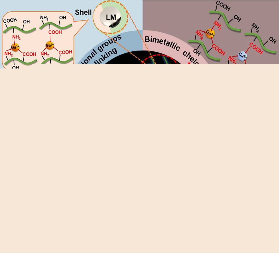 液態金屬具有良好的導電/導熱特性和良好的流動性,是制備功能化柔性電子的理想材料。但是液態金屬超高的表面張力,難以實現加工成形和功能化。雖然通過微納化處理,能夠有效降低其表面張力,但是由于其高密度和活躍的表面特性,獲得穩定的液態金屬微納液滴仍然是一個巨大的挑戰。針對以上問題,該團隊提出雙官能團協同錨定策略,在液態金屬微納液滴表面構建了堅固的外殼。即在羧甲基化殼聚糖(CMCS,含有豐富的羧基和胺基)溶液中對液態金屬進行超聲,制備了化學穩定性較高(> 7 d)的液態金屬分散液,再通過定向冷凍干燥的方法制備出具有Janus結構的氣凝膠。