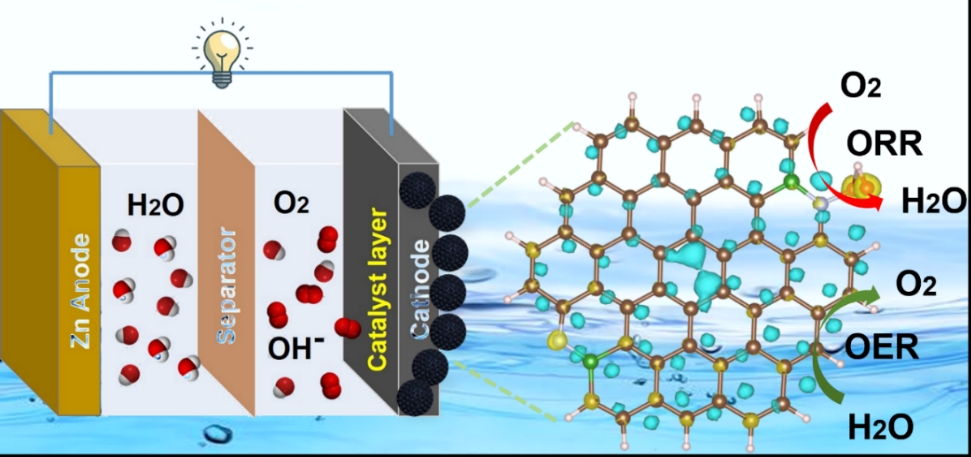 金屬-空氣電池作為解決能源轉換和儲存問題的替代方案,其效率受到氧還原反應(ORR)和氧析出反應(OER)緩慢反應動力學的制約。鑒于低儲量、高成本鉑基電催化劑使用的局限性,碳材料具有成本低、高機械強度、優良導熱性和導電性以及輕質等優勢,開發低成本、高效無金屬碳基雙功能電催化劑具有重要意義。為此,該工作通過硬模板法和物理活化法相結合策略,對碳基電極實現宏觀-微米-納米級多尺度結構調控,獲得有序分級孔結構與表面氮硼共摻雜基團結構協同優化,并有效調控了活性位點分布和局域電子環境。相比大多數碳基電催化劑,制備的富有序分級孔氮硼共摻雜碳微球電催化劑在鋅-空氣電池中實現了更高的電催化活性(ORR:起始電位0.996 V,半波電位0.889 V;OER:10 mA cm?2下過電位384 mV)與穩定性(長航時連續充放電358 h)。此外,該工作通過密度泛函理論(DFT)模擬揭示吡啶型N-B配對在鄰近N活性位點上的高效電子轉移途徑和OOH*吸附物種的轉換機制,為設計和優化碳基電催化劑的多雜原子配組與有序分級結構提供了新見解。