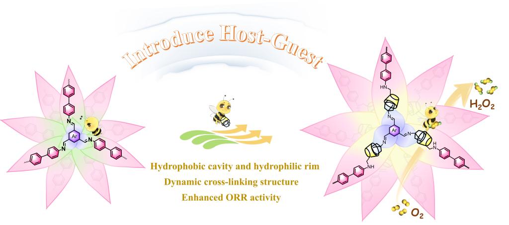 過氧化氫(H2O2)是一種高價值化學品,廣泛應用于能源儲存、污水處理、衛生消毒和紙漿漂白等領域。目前,H2O2的工業生產主要依賴于廢棄物密集型的蒽醌氧化工藝,這不僅引發環境問題與嚴重的安全隱患,還伴隨著昂貴的催化劑成本和巨大的能源消耗。電化學氧還原反應(ORR)因其溫和的水反應環境及能夠利用綠色電力作為能源輸入,而被視為一種清潔生產H2O2的有效途徑。非金屬碳基材料被認為是商業化的貴金屬基電催化劑的最有前途的替代品,但它們在實現高產物濃度與生產效率方面仍面臨著巨大挑戰。超分子聚合物,憑借其獨特的分子識別能力和動態交聯特性,在催化領域展示出了巨大潛力。然而,針對高效氧還原制過氧化氫的超分子電催化劑少有研究。因此,設計具有高效選擇性和ORR活性的超分子氧還原電催化劑用于H2O2合成尤為迫切和重要。