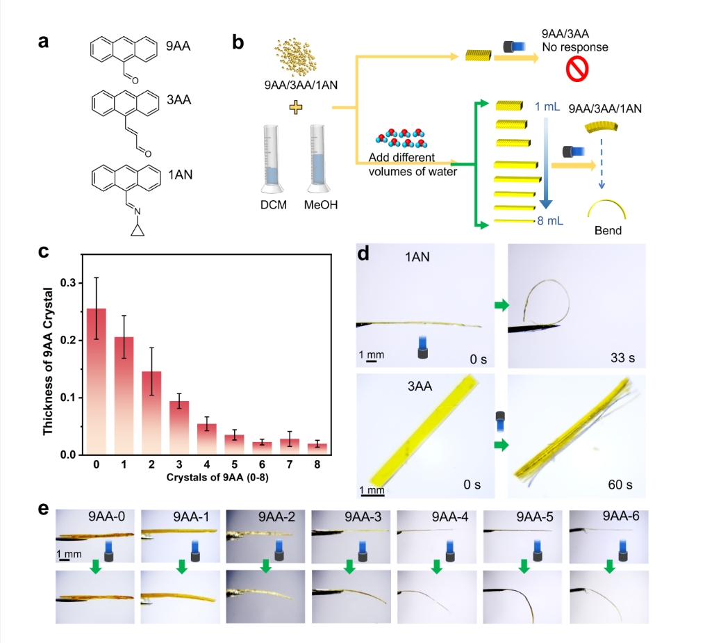 刺激響應晶體作為一類新型智能材料,在諸如光、熱、機械力等外界刺激下能夠發生顯著的理化性質變化。其中,光機械響應晶體具備將光能直接轉化為多種機械形變與運動的能力,并在軟體機器人、致動器及仿生運動等領域具有重要的潛力應用。然而,該研究領域依然面臨調控結晶過程困難、晶體生長尺寸對材料形變影響機制不清晰,以及響應過程如何保持結構完整性等諸多關鍵科學問題。本研究團工作利用水輔助沉淀法,室溫下制備出厚度可控的蒽衍生物晶體,在光照條件下通過[4+4]環加成反應誘發晶體彎曲和分裂的光機械響應行為,賦予了材料連續向光、背光彎曲、撕裂成晶體纖維等特性,并對其運動的幅度、方向和類型進行精確控制,初步探索了光機械響應晶體在模擬類人運動微型機器人方面的應用等。