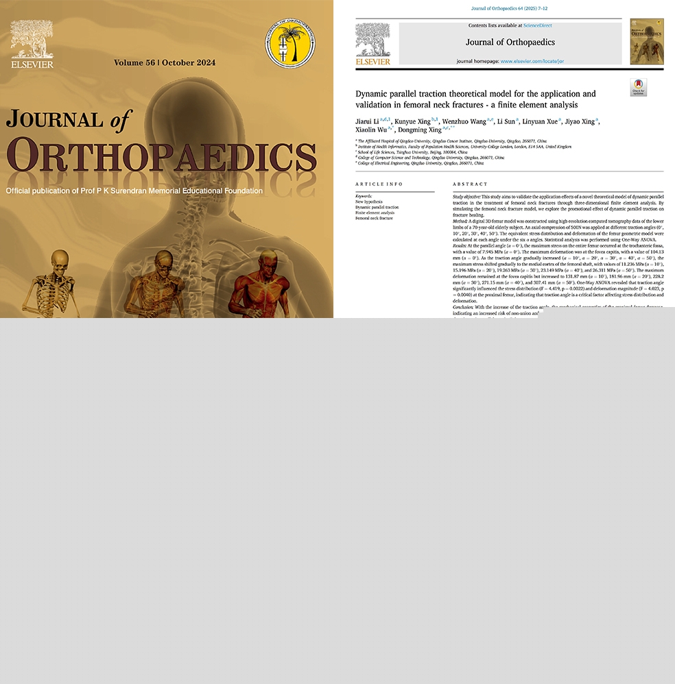 新聞網訊 近日,我校腫瘤研究院培養的本科生雙創團隊成員李佳睿以第一作者在Elsevier旗下骨科前沿研究期刊《骨科雜志》(Journal of Orthopaedics)發表高水平論文“Dynamic parallel traction theoretical model for the application and validation in femoral neck fractures - a finite element analysis” (DOI:10.1016/j.jor.2024.10.057)。文中首次驗證了動態平行牽引的理論可行性及在促進骨折愈合,降低愈合并發癥風險的潛在價值。論文通訊作者為邢東明教授和吳曉淋博士,青島大學附屬醫院和青島腫瘤研究院為第一單位和通訊單位。