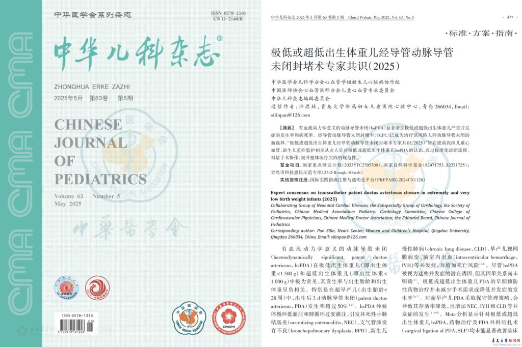 新聞網訊 近日,由青島大學附屬婦女兒童醫院黨委書記、著名兒科心臟病學專家泮思林教授團隊牽頭制定的《極低或超低出生體重兒經導管動脈導管未閉封堵術專家共識》在國內頂級兒科雜志《中華兒科雜志》正式發布。這是國內首個針對極低或超低出生體重兒經導管動脈導管未閉封堵術的專家共識,填補了國內該領域的空白,將為提高我國極低或超低出生體重兒動脈導管未閉的治療水平提供重要指導,標志著醫院在先心病介入治療領域持續保持國內領先地位。