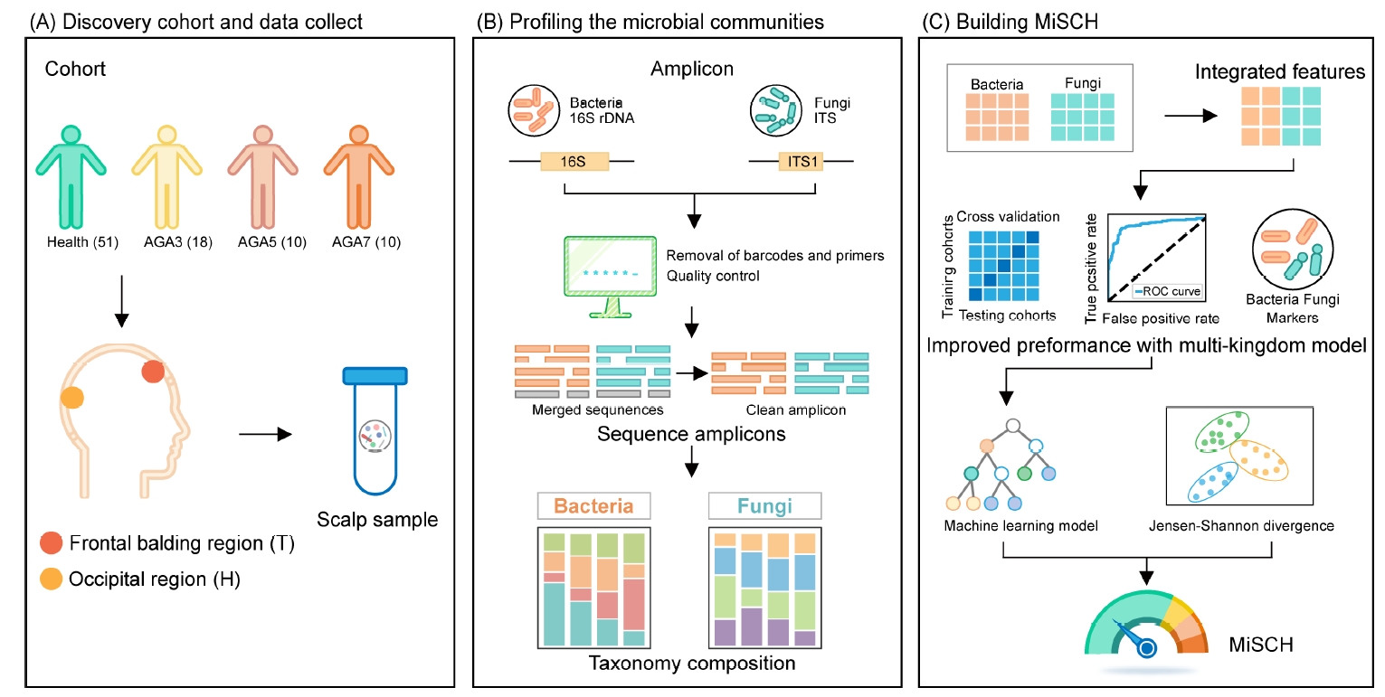 圖1. 實驗設計與數據分析總體示意圖。(A)隊列設計與樣本采集。(B)微生物組分析與多樣性分析。(C)基于MiSCH(頭皮微生物健康指數)進行AGA評估和預測。