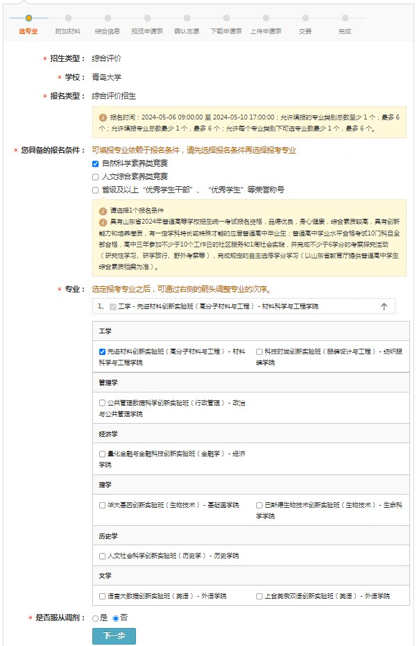 選擇符合選考科目要求的專業,最多選擇6個,請選擇是否服從調劑。