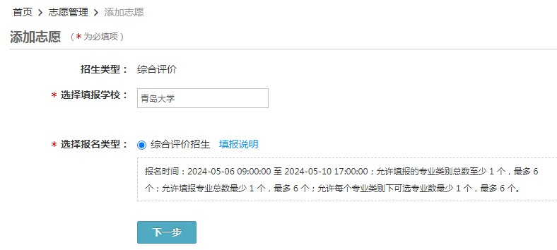 點擊“志愿管理”后,再點擊“添加志愿”,選擇點擊“青島大學”