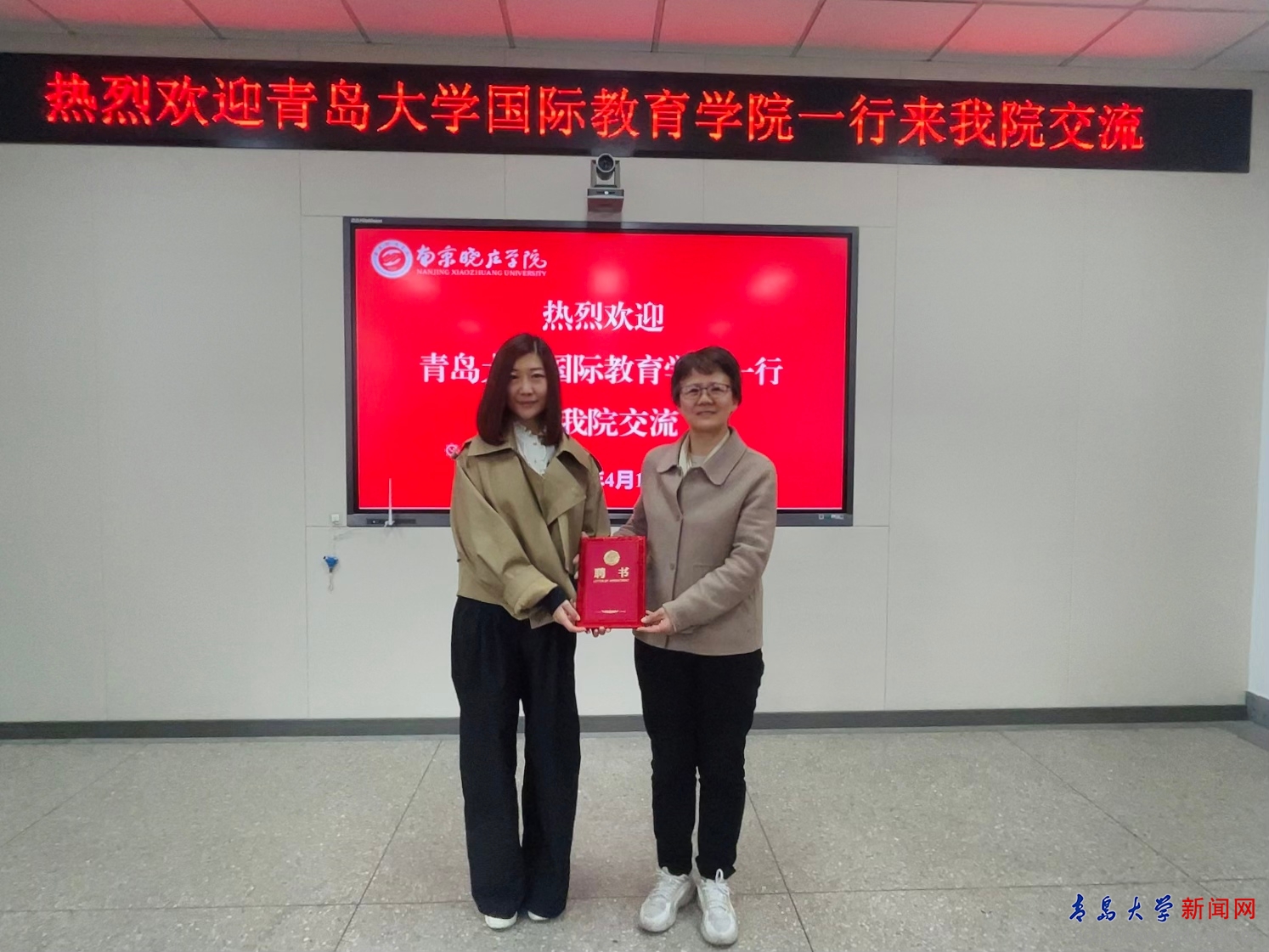 紀皓瑛向張謙芬頒發聘書,聘任張謙芬為青島大學國際教育學院兼職教授。