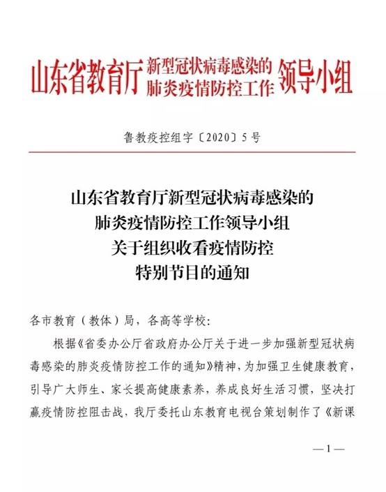 附:《山東省教育廳新型冠狀病毒感染的肺炎疫情防控工作小組關于組織收看疫情防控特別節目的通知》(魯教疫控組字[2020]5號)文件